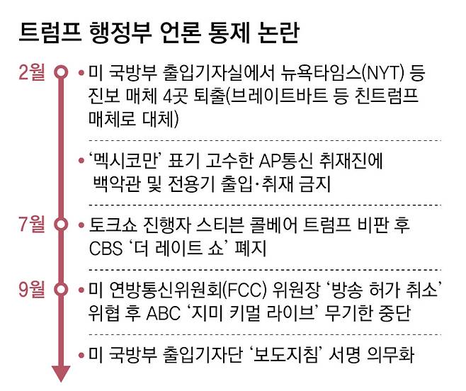 국방부의 이번 조치는 트럼프 행정부에서 표현의 자유와 언론 통제에 대한 논란이 격화하는 가운데 발생했다. 앞선 17일에는 ABC방송의 유명 심야 토크쇼 ‘지미 키멀 라이브’가 연방정부의 공개적인 압력 발언 뒤 방영이 무기한 중단됐다. 15일 진행자 지미 키멀이 방송 중 “마가(MAGA·미국을 다시 위대하게) 세력이 이번 일(커크 사망)로 정치적 이득을 얻기 위해 별짓을 다 하고 있다”고 비판한 발언이 논란이 된 것. 당시 연방통신위원회(FCC)의 브렌던 카 위원장은 “우리는 이 문제를 쉬운 방식으로 처리할 수도 있고, 어려운 방식으로 처리할 수도 있다”며 ABC에 사실상 방송 면허 취소를 시사한 것으로 드러났다.