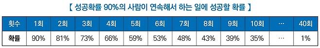 이처럼 어떤 일의 성공확률이 90%를 갖춘 사람이라고 해도 10회 연속으로 성공할 확률은 35%까지 낮아진다. 반대로 말하면, 이것은 90%의 성공확률을 가진 사람이라고 해도 10회 실시해서 그중에 적어도 1회 이상 실패할 확률이 65%라는 뜻이다. 더욱이 40회 연속으로 성공할 확률은 1% 정도밖에 되지 않기 때문에, 40회 중에 적어도 1회 이상 실패할 확률은 99%가 된다.