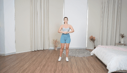 바닥에 서서 양발을 어깨너비로 벌리고 섭니다. 왼쪽 무릎을 공중으로 들어 올리며 양손을 모아 무릎을 터치합니다. 이어서 원래 자세로 돌아가 오른쪽 무릎을 들어 올리고 같은 동작을 반복합니다.