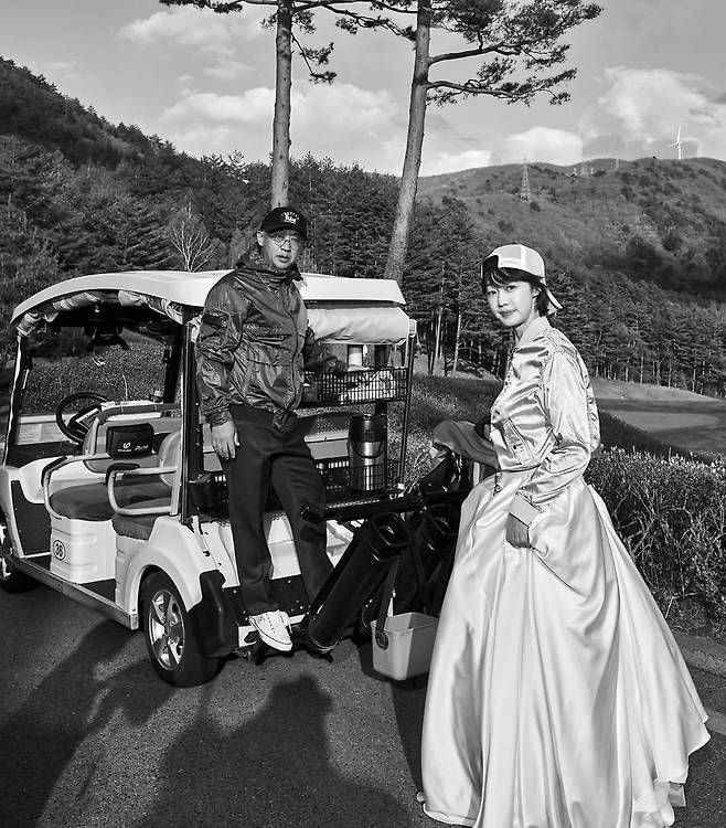 입은 채 골프채를 들고 있는 독특한 콘셉트가