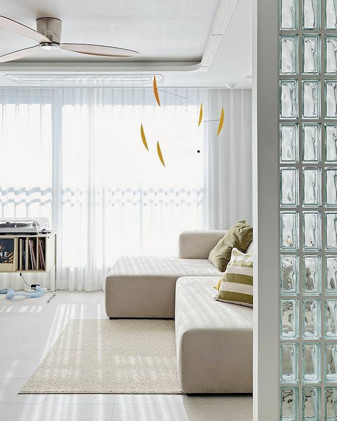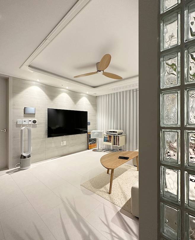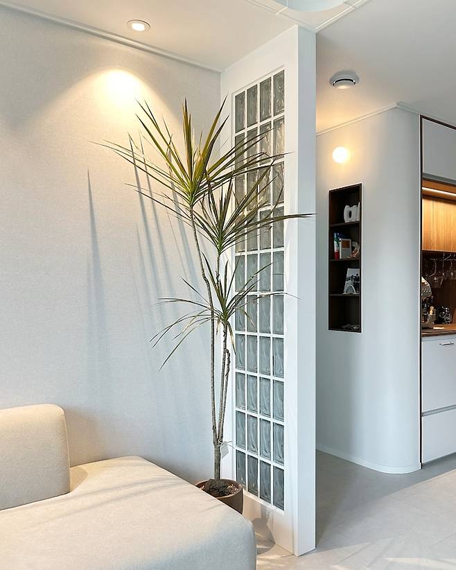 오히려 소파에서 주방 시선을 차단시켜 시공 후 더 만족스러웠던 것 같아요! 가벽 설치로 거실이 좁아 보이면 어쩌지 걱정했지만 빛도 잘 투과되어 전혀 답답하지 않고 유리블럭을 정사각형에서 직사각형으로 변경하여 가벽 폭을 줄이기 잘한 선택이었어요.