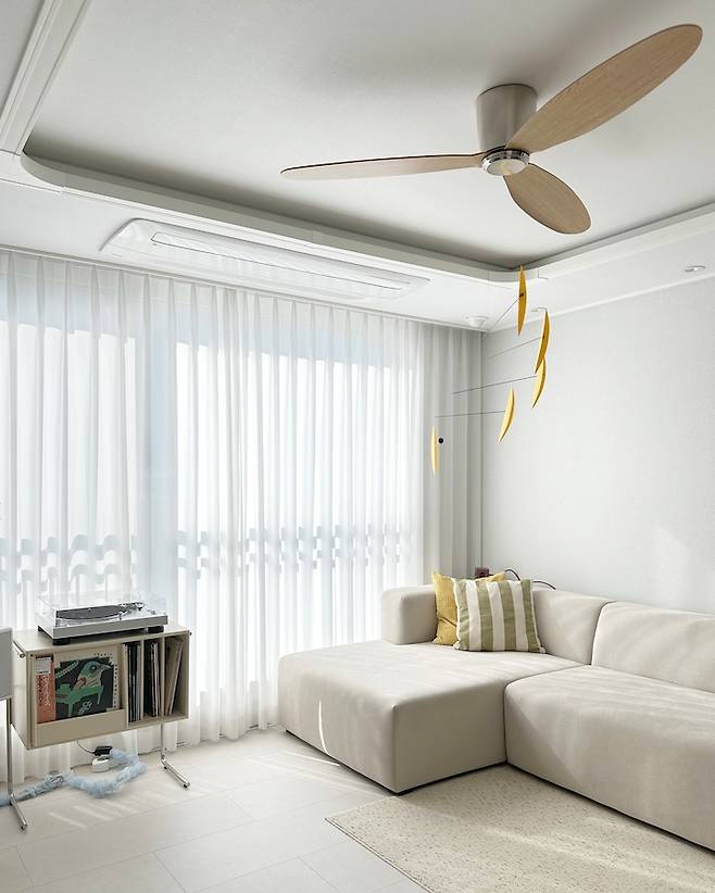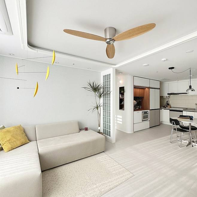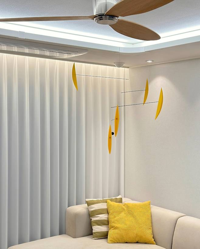 제가 옐로 컬러를 좋아하다 보니 의도치 않게 저희 집 포인트 컬러가 되어버렸네요^^ 모빌은 입주하기 전부터 구매해둔 상품으로 이 곳에서 드디어 존재를 뽐내고 있어요. TV 시청에 시야가 방해될까 소파 쪽으로 두었는데 소파에 앉아있으면 생각보다 존재감이 느껴지지 않고, 실링팬 바람에도 크게 휘날리지 않아서 지금도 잘 사용하고 있답니다.