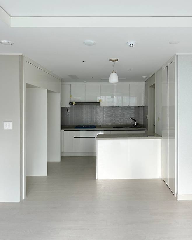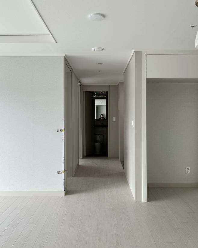 거실과 주방을 가로지르는 벽들이 매우 각지고, 그레이빛 베이지톤이 감도는 복도입니다.