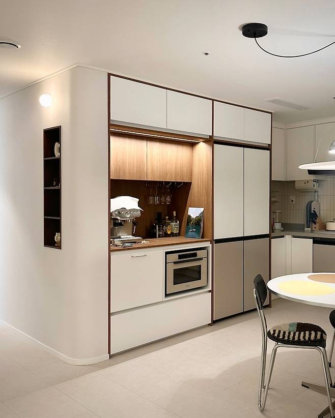중문이나 거울 등으로 아치 느낌을 대체할 수 있었지만 평소에도 존재감을 크게 두고 싶었기 때문에 부담 없었던 팬트리 도어를 철거 후 시공하게 되었답니다. 원형 식탁과 조명까지 잘 어우러져 마치 카페나 레스토랑에 와있는 기분이 들어 제가 좋아하는 공간이 되었어요.