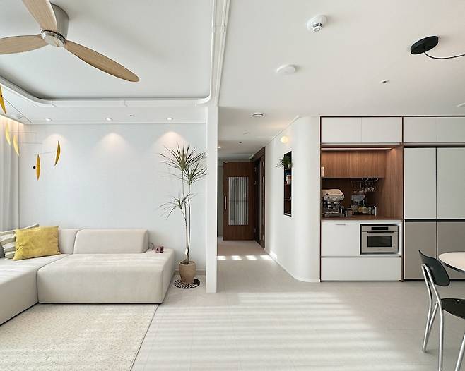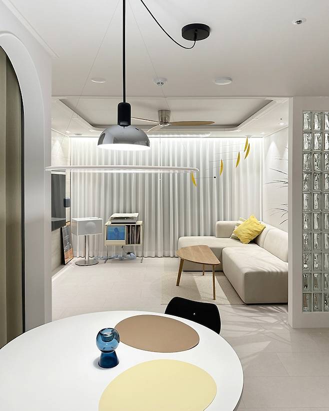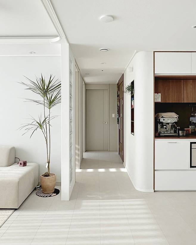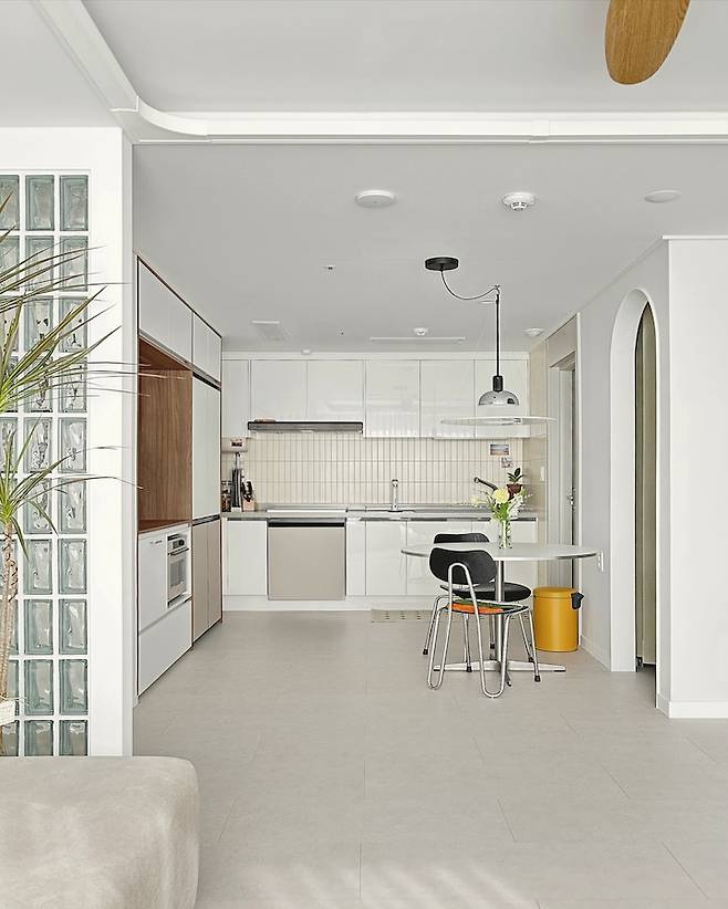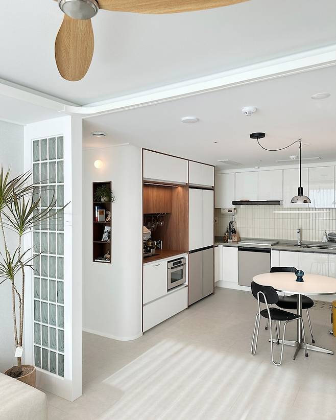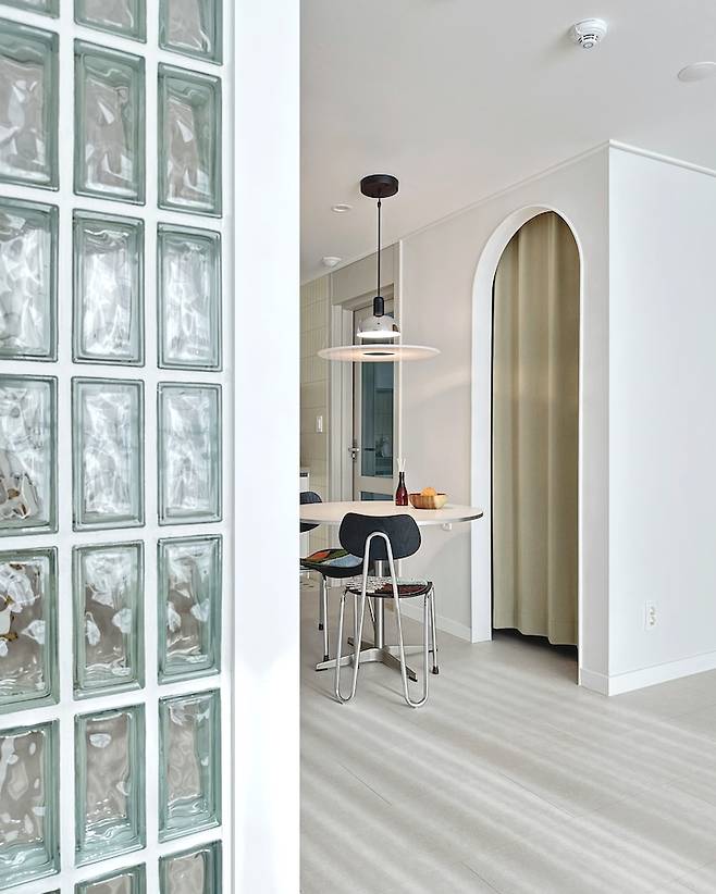복도에서 주방으로 이어지는 벽면을 라운드로 마감하여 보다 부드럽고 여유로운 공간감을 내어준 듯 보이고요, 화이트 계열 도배지로 새롭게 덮어주어 복도가 한 층 밝아진 느낌이에요. 또한 거실 쪽 복도 연장선을 따라서 유리블럭 가벽을 설치하였지만 유리의 투명함으로 답답해 보이지 않게 잘 연출된 듯합니다.