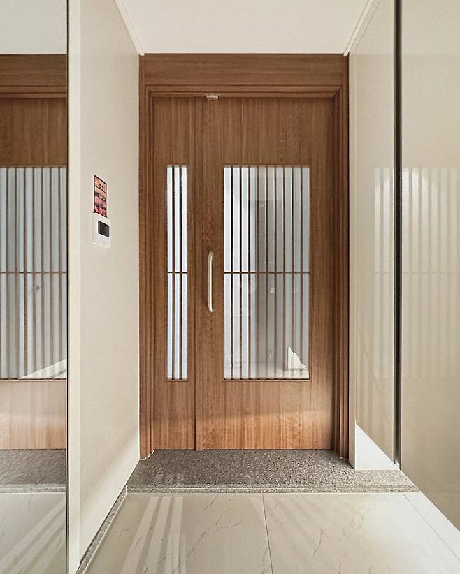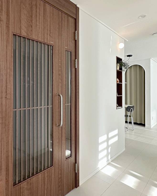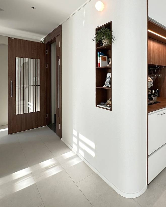 간살이 포인트 된 우드 중문과 매립선반, 아치게이트가 한눈에 담기는 애정 하는 구도입니다❤️