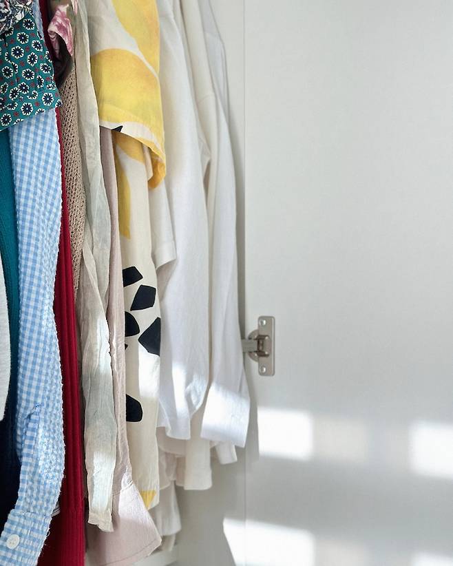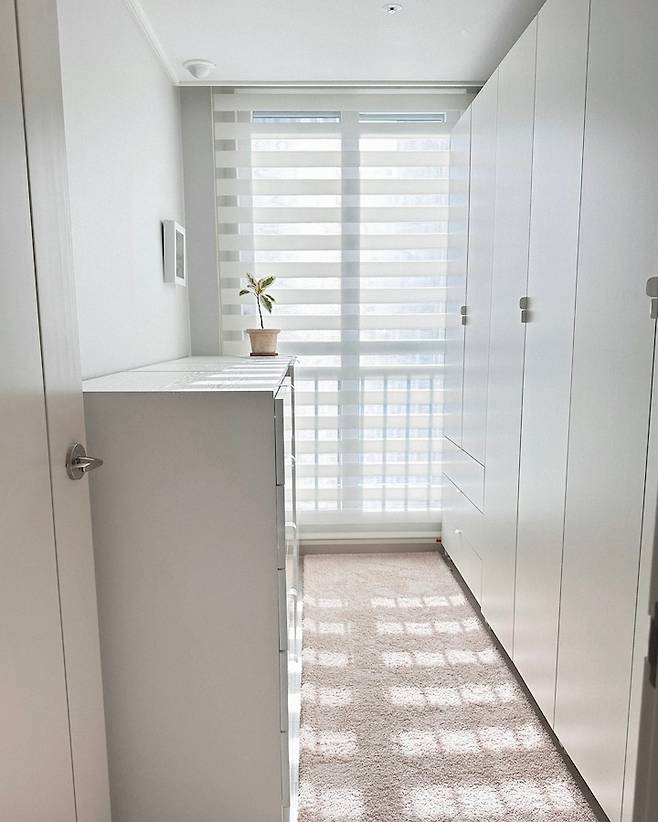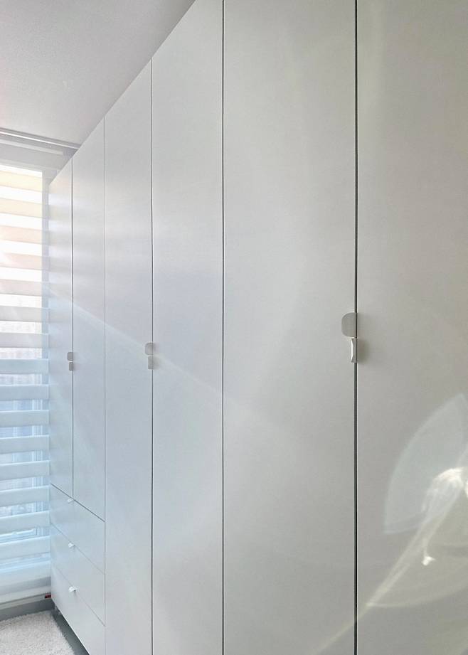 알파룸의 아담한 사이즈만큼 드레스룸도 깔끔하게 보여야겠다고 생각이 들어 처음으로 도어가 있는 장을 사용해 보았어요. 도어랑 칸막이 부분만 막혀있고 벽면 쪽으로는 뻥-뚫린 맞춤식으로 통풍력이 좀 더 좋을 거라 생각되어요. 또한 강렬한 햇빛에 옷에 변색도 차단해 줄 테니 잘된 일이에요.