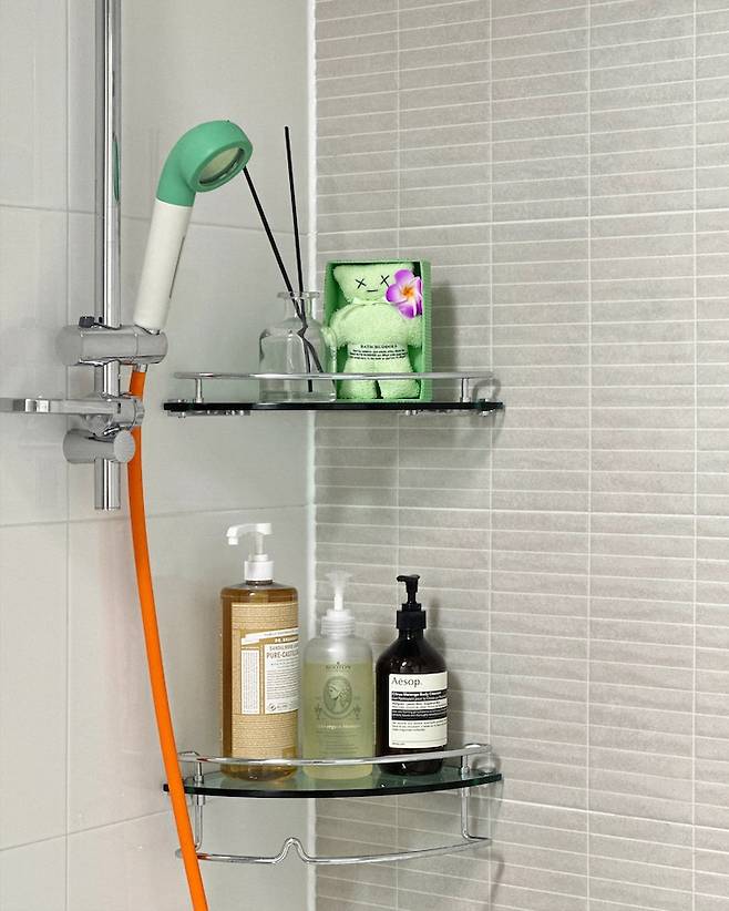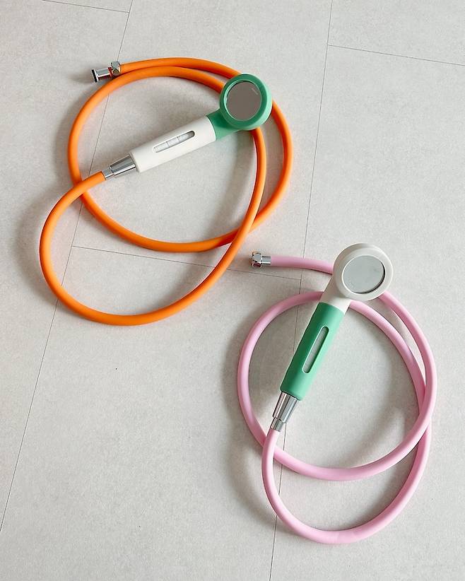 컬러풀한 두 가지 컬러의 샤워기 커버를 믹스하여 공용/부부 욕실에 각각 설치해 주었습니다. 리모델링을 따로 하지 않은 일반적인 아파트 욕실 디자인에 귀여움 한 스푼 추가되어 소소한 기분전환에 좋더라고요:D