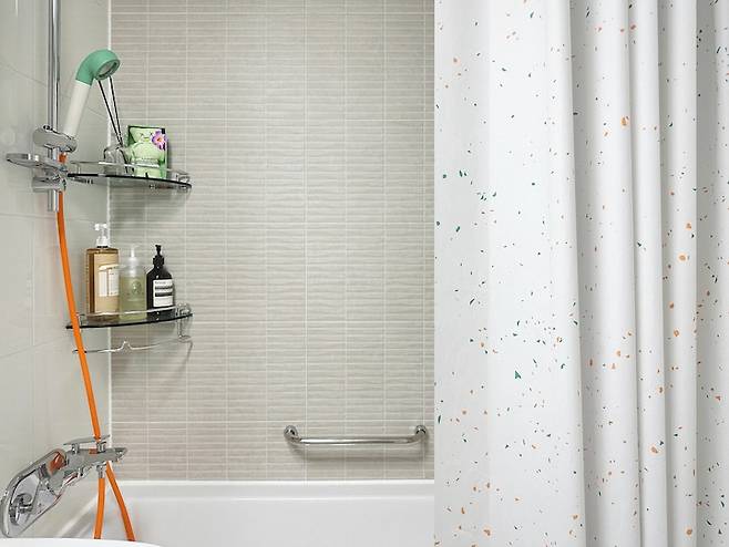 그리고 저희 집 욕실들은 물이 직접적으로 닿는 곳 이외에는 건식으로 사용하고 있어서 욕조를 가려줄 샤워커튼을 달아주었어요. 의도하지는 않았지만 샤워커튼과 샤워기에 포인트 컬러가 같아 세트인 듯 사용하고 있습니다.