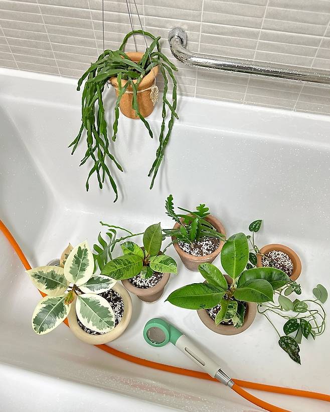 결혼생활 후 처음 생긴 욕조에 저희 집 식물들도 오손도손 모여 물 샤워도 할 수 있게 되었네요:)