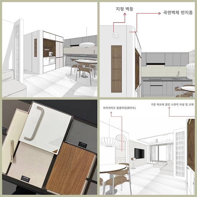 - 주방 : 냉장고장(매립선반/라운드벽/홈카페장), 주방타일 덧방, 아일랜드 식탁 철거, 팬트리 아치게이트 및 도배