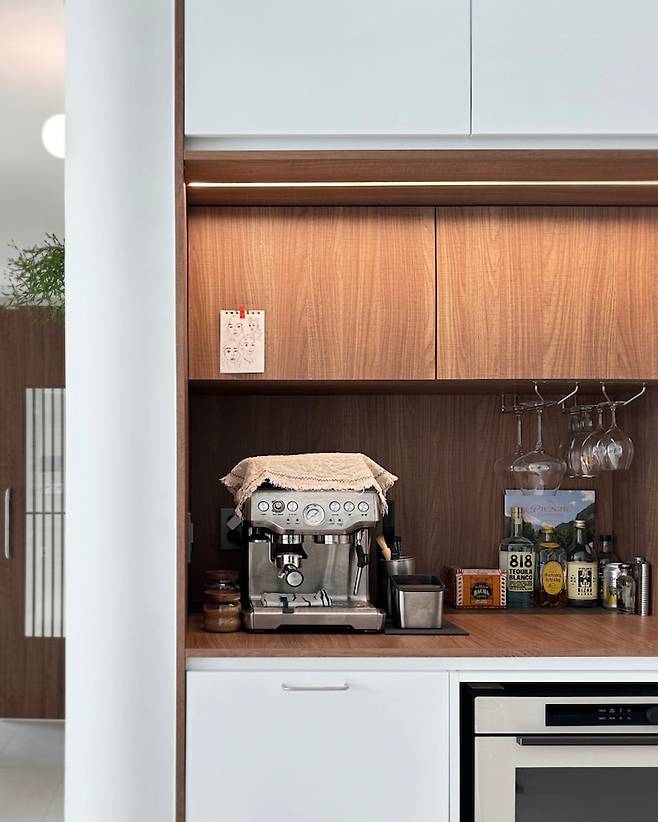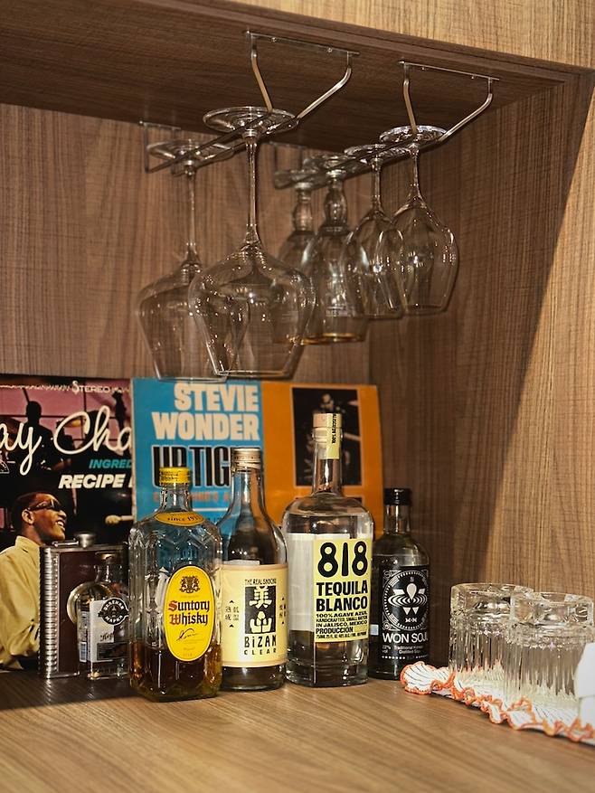 역시 빠질 수 없는 저희 집 주방의 저녁 분위기입니다. 따뜻한 전구색 조명으로 우드가 더욱 고급스럽게 연출돼 집에서도 충분히 분위기를 만끽하며 술 한잔할 맛이 납니다. 저희 부부는 술을 자주 마시거나 좋아하지 않지만 간혹 한 잔씩 마시는 걸 좋아하기 때문에 앞으로 더욱 예쁜 술병들로?! 미니 홈바를 채워 나가보려 해요:)