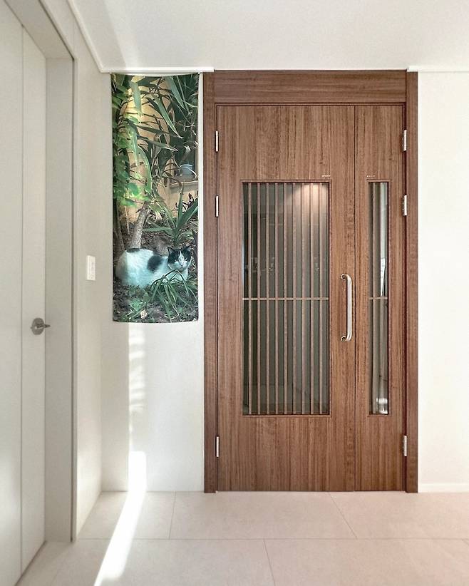 그리고 저희 집 배전함이 일반 가정용보다 큰 사이즈라 맘에 쏙- 드는 커버를 찾기 힘들었는데, 이제는 별이 된 저희 고양이와 닮은 패브릭 포스터를 오늘의집에서 발견하게 되어 바로 배전함 가리개로 활용하였어요. 덕분에 바쁜 일상에서도 매일 저희 고양이를 잊지 않고 생각하며, 중문과도 잘 어울려서 다행입니다:D