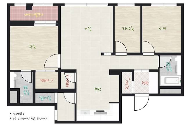저희는 신혼희망타운 청약에 당첨이 되어 3년 기다림 끝에 55B 타입으로 입주하였어요. 확장형 23평 4bay 구조로 방 3개와 화장실 2개, 팬트리가 무려 3개나 되어 더욱 마음에 들었어요! 모든 방들과 거실은 통창문 샷시(새시)로 시야가 넓고 남서방향으로 1시부터 해질 녘까지 빛이 매우 잘 드는 채광 좋은 집이에요 :D
