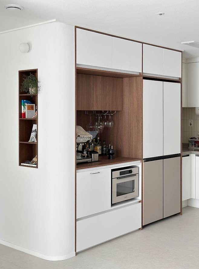 키친핏 냉장고 사이즈에 맞게 장을 맞추고, 여유 있게 남은 공간에는 아일랜드 식탁을 철거하여 부족했던 수납들을 미니 홈바&홈카페장과 함께 알차게 채워주었어요.