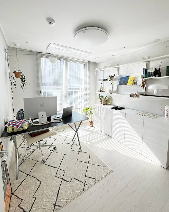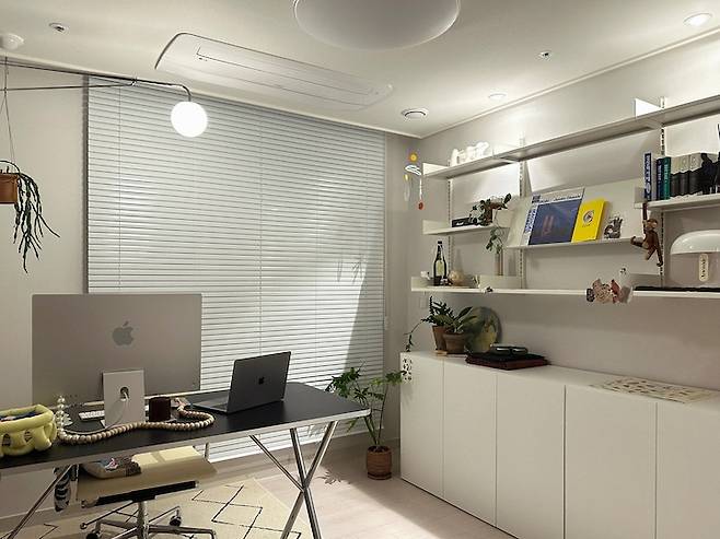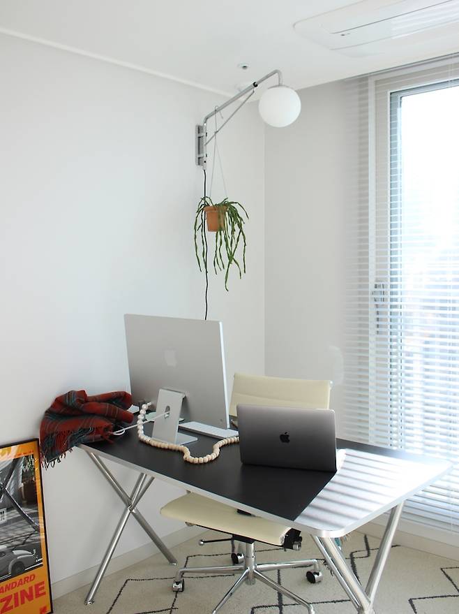 저는 재택근무와 프리랜서를 겸하고 있어서 하루에 반 이상은 이 곳에서 시간을 보내고 있어요. 그렇기 때문에 사무적이면서도 좀 더 감각적인 공간을 원했기 때문에 인테리어 시공보다는 홈스타일링에 중점을 두어 꾸며 보았습니다.