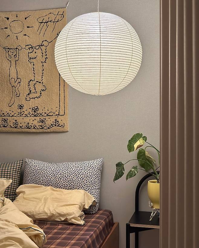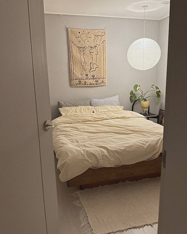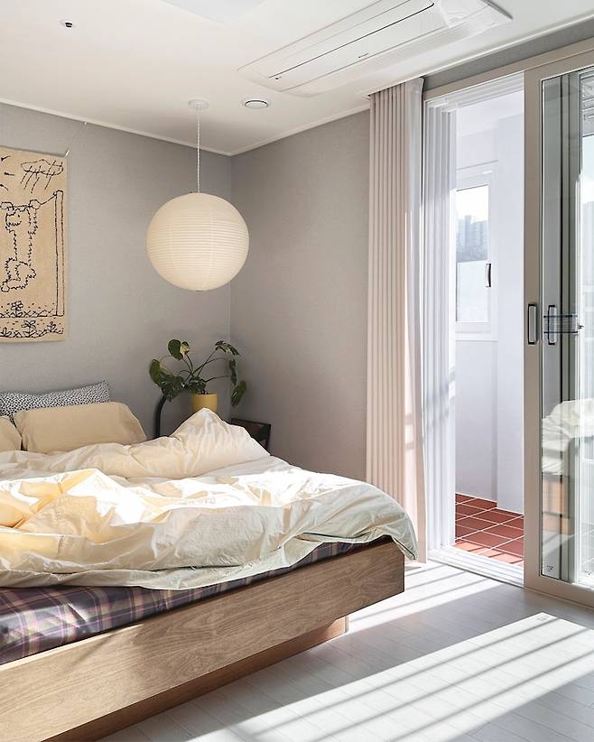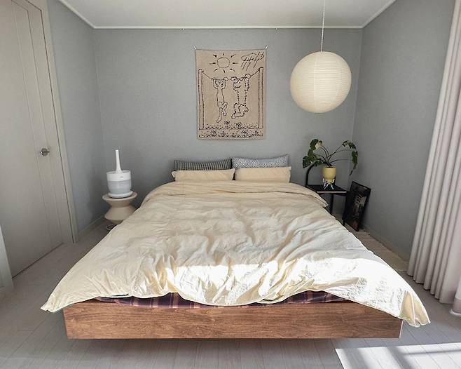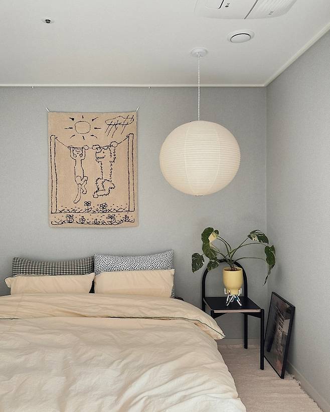 침실은 침대와 협탁으로 사용할 소가구로만 간단하게 배치하였고 그 외 포인트 될 소품들로 침실을 꾸며보았습니다. 가구와 침구 등 일부러 각기 다른 디자인으로 조합하는 것이 제겐 도전이었지만, 마치 저희 부부와 침실 액자의 그림처럼 다른 듯 조화로운 느낌에 더욱 매력적으로 와닿는 공간이 되었어요.