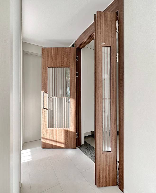 저희 집 중문은 '비대칭 양개형 or 여닫이' 도어입니다. 생소한 디자인이었지만 튼튼하고 안전해 보여서 간살이 포인트인 우드 중문으로 설치하게 되었어요. 프라이빗하면서도 간살 사이로 은은한 비침이 답답해 보이지 않아서 좋았고요, 가구들 중에 스텐/실버가 포인트 된 것들이 많아 중문 손잡이와 경첩들도 실버로 선택하여 저희 집 인테리어에 큰 이질감이 없도록 하였습니다.