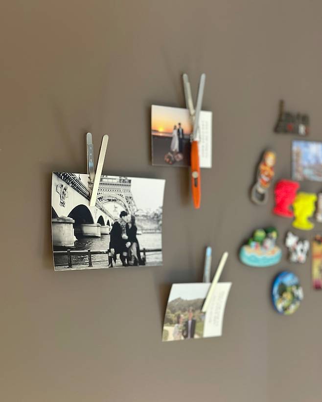 현관에는 여행 다니면서 모았던 마그네틱들과 신혼 감성을 되살려줄 달달한 사진들로 꾸며보았어요. 마스크와 이것저것 간단하게 걸어둘 수 있는 강력한 다용도 마그네틱 집게도 활용도가 아주 좋아요.