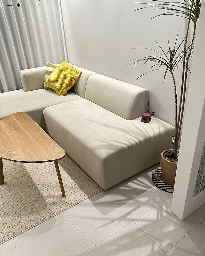 전보다 넓어진 소파 사이즈가 저희 둘이 사용하기에는 충분했기에 큰 공간을 차지하지 않아 멋스러운 큰 식물을 옆에 두기도 딱 좋았고요, 소파에 누어 실링팬에 살랑이는 바람과 함께이면 마치 휴양지 기분도 느낄 수 있답니다!
