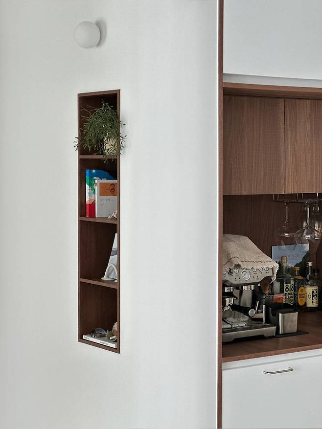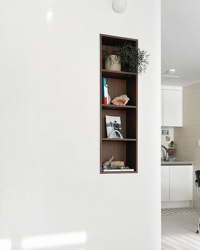 복도 끝에 위치한 매립선반도 저의 작은 인테리어 로망 중 하나였어요. 실용적인 수납 활용보다는 예쁘게 보여주고 제 만족을 위한 무언가들로 채우는 소소한 힐링존으로 사용하고 있습니다.