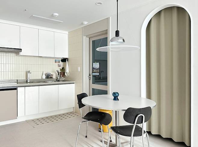 아일랜드 식탁을 철거한 자리에 원형 식탁을 여유롭게 둘 수 있어서 좋았어요! 주방 팬트리 도어를 철거 후 개방형 아치게이트로 시공하고, 커튼으로 개방감을 가볍게 차단해 주었답니다.