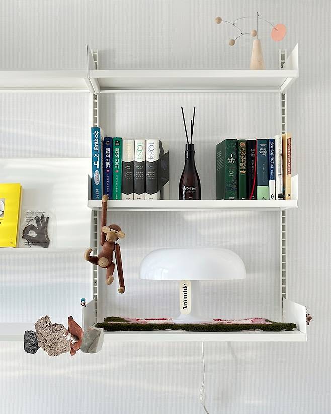 작업실로 사용하고 있지만 단정하고 딱딱한 이미지보다는 좀 더 내추럴한 느낌을 원했기 때문에 모듈 시스템 선반으로 설치하게 되었어요. 아무래도 책장보다는 시각적으로도 개방감이 느껴지고 아이템에 따라서 좀 더 다양하게 연출할 수 있는 공간 활용도가 좋아 보였어요. 선반 사이즈에 맞추어 아래 낮은 수납장을 추가 설치해서 잡동사니 등 깔끔하게 수납공간을 보충해 보았습니다.