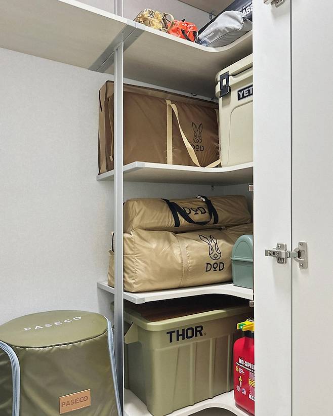 저희 부부는 가끔 캠핑도 다니기 때문에 짐들을 수납할 공간이 항상 부족했었는데 신발장 맞은편에는 다용도 팬트리장이 있어서 캐리어들까지 넉넉하고 깔끔하게 정리할 수 있게 되었어요. 예쁘게 꾸며진 곳은 아니지만 자랑하고 싶을 만큼 만족스러운 공간이에요:)
