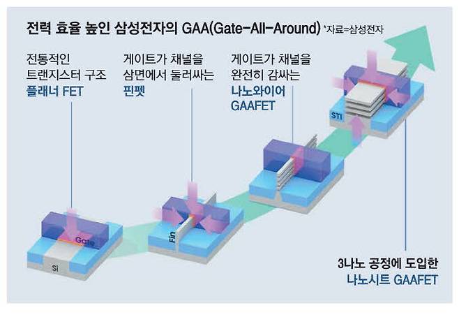 이 때문에 수많은 기업이 저전력·저발열 반도체 기술 개발에 매진 중입니다. 반도체 설계 차원에서는 삼성전자가 트랜지스터 전류를 3면이 아닌 4면에서 제어해 전류 누설을 줄이고 전력 효율을 높이는 게이트 올 어라운드(GAA·Gate-All-Around)를 개발했습니다.