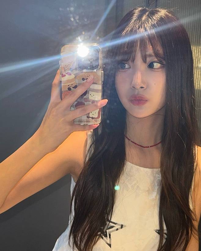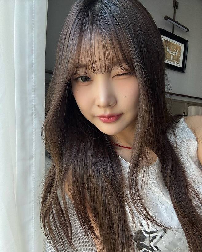 이번 셀피에서 가장 눈에 띄는 포인트는 ‘내추럴 뱅’ 스타일이다. 민서는 눈썹을 살짝 덮는 자연스러운 시스루 뱅으로 얼굴형을 부드럽게 감싸면서도 소녀 같은 매력을 강조했다. 거기에 은은한 웨이브가 섞인 긴 생머리는 특유의 청순함을 한층 배가시켰다. 햇살을 머금은 듯한 자연광과 맞물리며, 그녀의 피부톤은 더욱 밝고 투명하게 빛났다.