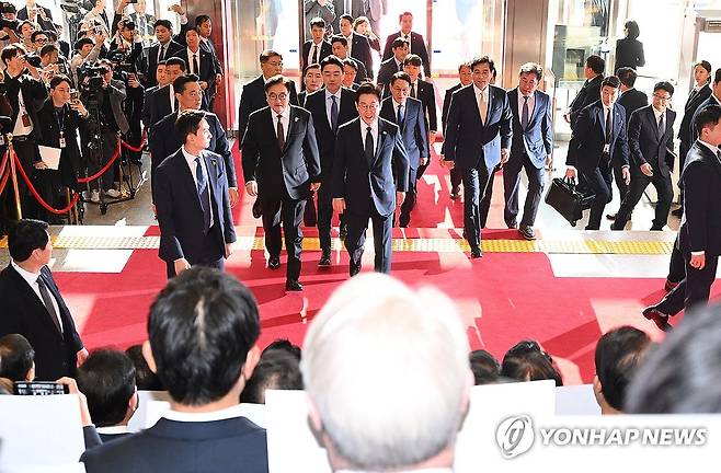 (서울=연합뉴스) 이재명 대통령이 4일 내년도 정부 예산안에 대한 시정연설을 하기 위해 서울 여의도 국회에 도착해 피켓시위를 하는 국민의힘 의원들 앞을 지나고 있다. 국민의힘 의원들은 추경호 전 원내대표에 대한 내란특검팀의 영장청구에 반발하며 야당 탄압 중단을 촉구했다. 2025.11.4 [국회사진기자단]