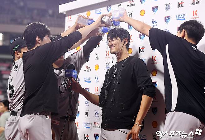 KT 투수진은 토종 에이스의 부활투를 격하게 반겨줬다. TV 중계 인터뷰를 진행하고 있던 고영표에게 물폭탄 세례를 뿌렸다. 고영표가 특별한 기록을 추가한 건 아니었지만 KT 투수진도, 고영표도 웃으면서 하루를 마감했다.
