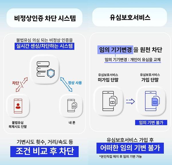 동일한 번호의 2개 회선이 동시에 통신망 시스템에 접속하는 것도 불가능하다. 단 휴대폰 전원이 꺼져 있는 시점에는 복제폰이 통신망 시스템에 접속할 가능성이 있다. 이러한 가능성마저 차단하는 것이 FDS와 유심보호서비스다. 유심보호서비스는 유심과 휴대폰을 하나로 묶어 관리하는 서비스다. 유심을 복제해 다른 휴대폰으로 기기를 변경하는 시도를 차단한다. 유심보호서비스에 가입하면 누군가 유심을 복제하더라도 해당 유심을 사용할 수 없다.