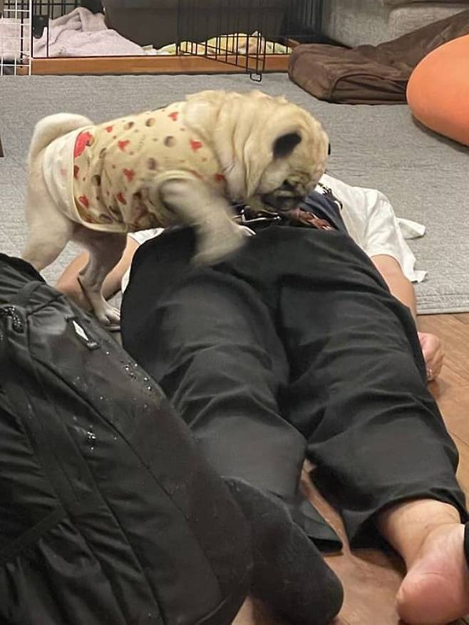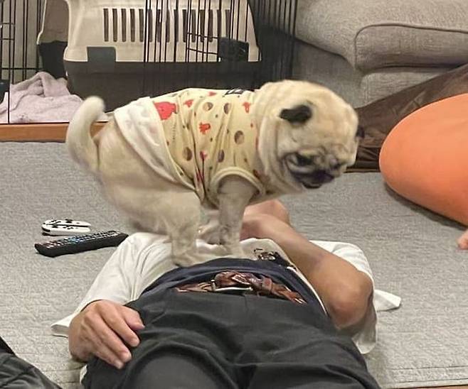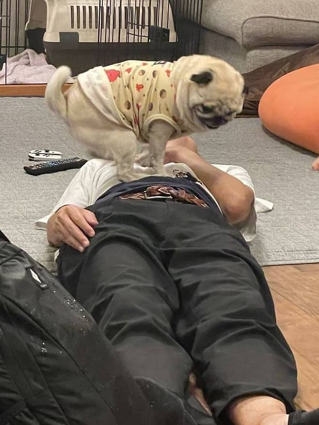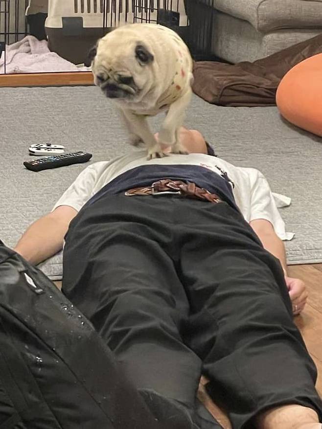 공개된 사진 속에는 퇴근하고 집에 도착하자마자 바닥에 누운 아빠의 배에 아무렇지 않게 올라가 있는 힘껏 꾸욱 누르고 있는 퍼그 강아지 모습이 담겨 있었죠.