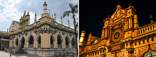 인도 이슬람교도를 위한 싱가포르의 주요 모스크 중 하나다. 1859년에 지어진 이 사원은 남인도, 빅토리아, 그리고 무어 건축 양식이 혼재돼 있다. 모스크의 하이라이트는 정문의 해시계다. 해시계의 25개 태양 광선은 25명의 예언자의 이름을 새긴 아랍 서예로 장식되어 있다. 4000명을 수용할 수 있는 사언은 고급 아랍어 서예와 스테인드글라스 창문으로 화려하게 꾸며져 있다.