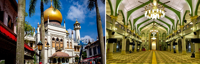 술탄 모스크는 캄퐁 글램과 아랍스트리트의 심장부에 위치해 있다. 모스크는 싱가포르의 첫 술탄인 술탄 후세인 샤(Sultan Hussein Shah)를 위해 1824년에 지어졌다. 모스크는 싱가포르의 다른 모스크와 마찬가지로 인도-사라센(Indo-Saracenic) 양식을 보인다. 이는 전통적인 인도 및 이슬람의 건축 양식과 유럽의 건축적 특징이 혼재된 스타일이다. 술탄 모스크의 상징은 두 개의 황금색 돔이다. 하나의 돔은 정문 현관을 덮고 있고, 다른 하나는 술탄의 후손과 왕족들의 묘를 덮는다. 술탄 모스크는 과거에 무슬림 순례자들의 경유지 역할을 했으며, 싱가포르 이슬람교도들의 결속과 단결을 상징한다.