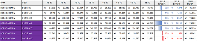 데이터 집계 기간(4월 2주~6월 1주)에 삼성전자 DDR4 3,200MHz 8GB(-5.28%), 16GB(-1.98%), 32GB(-2.55%), 삼성전자 DDR5 5,600MHz 16GB(-17.10%), 32GB(-8.23%), 마이크론 DDR5 5,600MHz(+0.73%), 32GB(+4.17%) 를 기록.