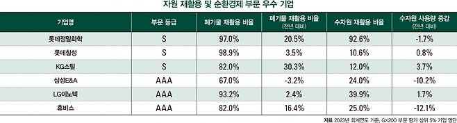 자원 재활용 및 순환경제 부문에서는 폐기물·수자원 재활용 비율과 증감량 등을 확인했다. 부문 평가에서 롯데정밀화학·롯데칠성·KG스틸이 S 등급을, 삼성E&A·LG이노텍·휴비스가 AAA 등급을 받았다. 롯데정밀화학과 롯데칠성은 지난해에 이어 올해도 순환경제 부문에서 S 등급을 획득했다.