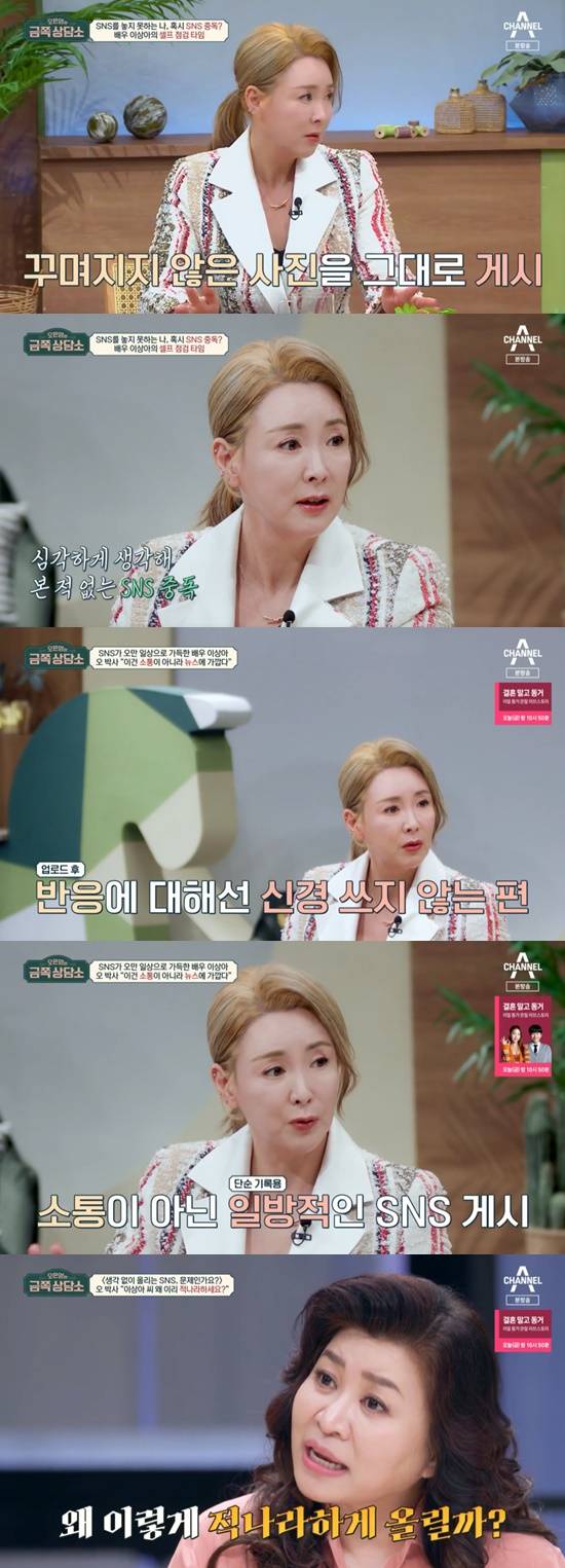 오은영은 "SNS가 소통의 기능을 가지고 있다면, 이상아 씨는 뉴스처럼 이용하고 있다"고 분석했다.