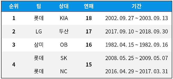 KBO 리그 특정팀 상대 최다 연패 TOP 4