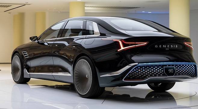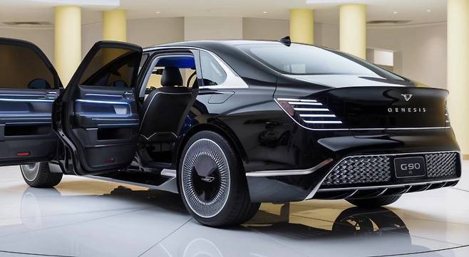 측면은 긴 휠베이스와 부드러운 루프라인이 만들어내는 유려한 실루엣으로 완성된다. 군더더기 없는 표면 처리와 매끈한 라인들은 ‘절제 속의 존재감’을 극대화하며, 후면부의 간결한 테일램프 디자인은 G90만의 ‘조용한 자신감’을 완성한다. 화려함 대신 품격으로, 과시 대신 정숙함으로 승부하는 전략이다.