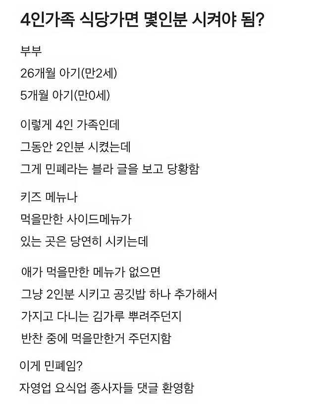4인 가족이 2인 분 시키는게 민폐인지 궁금한 사람