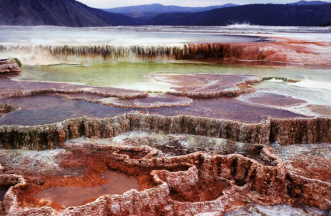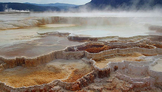 미국 옐로우스톤 국립공원에 있는 맘모스 핫 스프링스는 전세계에서 가장 큰 탄산염 온천입니다. 맘모스 핫 스프링스에는 칼슘 성분이 포함된 온천수가 지상으로 분출한 뒤, 대기중의 이산화탄소와 만나면서 굳어지게 되는데, 옐로스톤 국립공원의 백악질 기반암을 뚫고나오는 50여곳의 총천연색 온천으로 이루어져 있습니다.