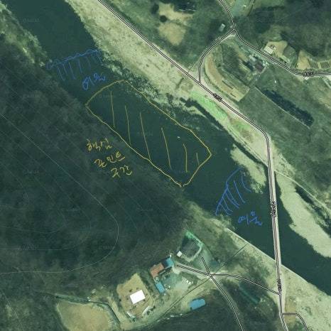 산 아래쪽이 수심이 깊은 물골 지역이지만