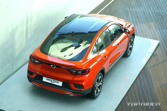XM3 E-TECH 하이브리드의 외관은 기존 XM3와 구분된다. 전면부 범퍼 하단에는 F1 다이내믹 블레이드 범퍼를 적용하고 블랙베젤 헤드램프를 새롭게 적용했으며, 전후방 건메탈 그레이 스키드와 크롬 가니시가 적용된다. 전용 컬러로는 오렌지와 웨이브 블루가 추가됐다.