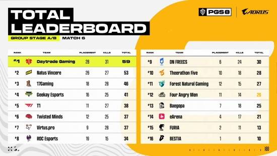 그룹 스테이지 A/B조 경기를 치른 결과, 데이트레이드 게이밍(DAY)이 59점으로 1위를 차지했다. 31킬, 순위 점수 28점을 기록한 이들은 파이널 스테이지 진출을 일찌감치 확정지었다.