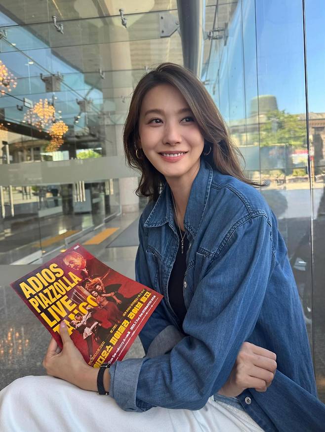 이너로는 블랙 슬리브리스를 입어 군더더기 없이 깔끔한 실루엣을 완성했고, 손에는 강렬한 색감의 공연 팸플릿을 들고 있어 시선이 자연스럽게 집중되죠.