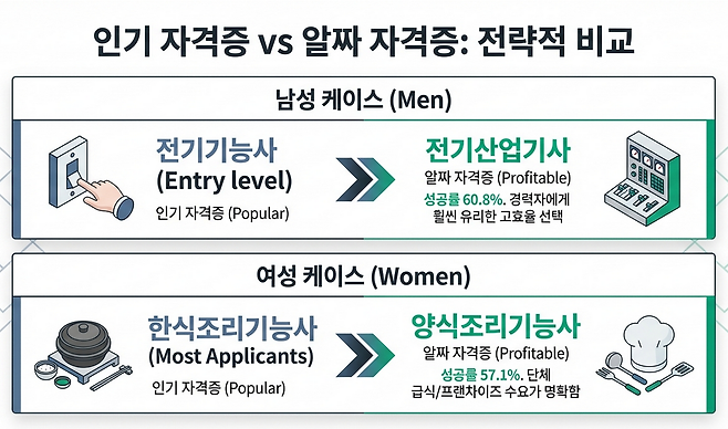 남성의 경우 전기와 냉동 기계 같은 전문 기술직이, 여성의 경우 조리와 디자인 같은 실무형 기능직이 실질적인 취업 '치트키' 역할을 하고 있었습니다.