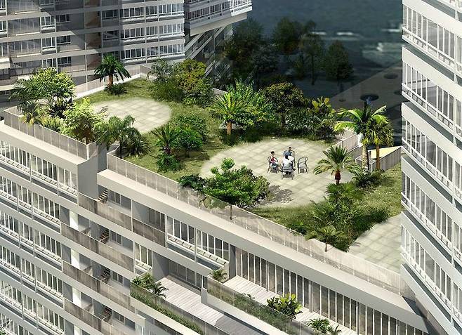 이와 같은 개방된 공용 공간을 통해 레저와 레크리에이션을 해결하고 동시에 이웃 간의 커뮤니티를 유려하게 만든다. 디자이너는 "멀티플 인도어 아웃도어 스페이스를 제공함으로 개인 공간과 셰어 공간의 문제를 동시에 해결하는 아파트 디자인"이라는 설명을 했다.