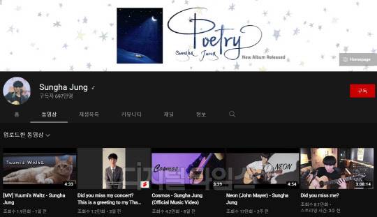 유튜브·인스타그램 빅데이터 분석사이트 IMR(Influencer Multi-Platform Ranking)의 9월 셋째 주 유튜브 순위에 따르면, 가장 인기 있는 채널 1위는 '정성하(Sungha Jung)', 2위는 '그랩 더 기타(Grab the Guitar)', 3위는 '유진 기타(YUJIN GUITAR)'다.
